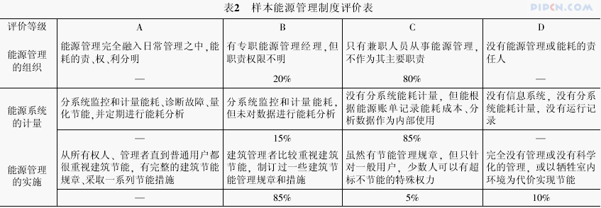 对大型商场能源管理的评价依据能源管理的组织、能源系统的计量、能源管理的实施三个方面进行,按照 A、B、C、D 四个等级打分。样本评价结果见表 2。从表2 中可以看出,商场类建筑能源管理基本反映了重庆市大型公共建筑整体能源管理水平,即建筑管理者比较重视建筑节能,但并没有形成完整的建筑节能规章与系统的节能措施;能源管理没有完全融入日常管理之中,能耗的责、权、利不分明;未进行分系统监控和计量能耗。