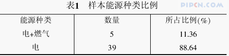 从样本建筑基本信息的统计中可以看到,目前涉及的商场类建筑样本 38.64%使用集中式全空气系统,84.09%建筑使用水冷式机组。能源种类以电为主,少部分使用燃气(见表 1)。在建筑围护结构类型方面,目前涉及的商场类建筑 65.91%使用混凝土剪力墙,29.55%建筑使用加气混凝土砌块,87.80%建筑使用单玻单层窗,75.61%建筑使用普通玻璃,75.61%建筑使用铝合金窗框,66.67%建筑无遮阳设置。