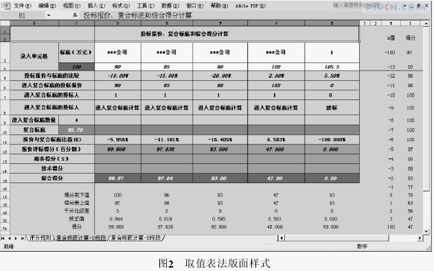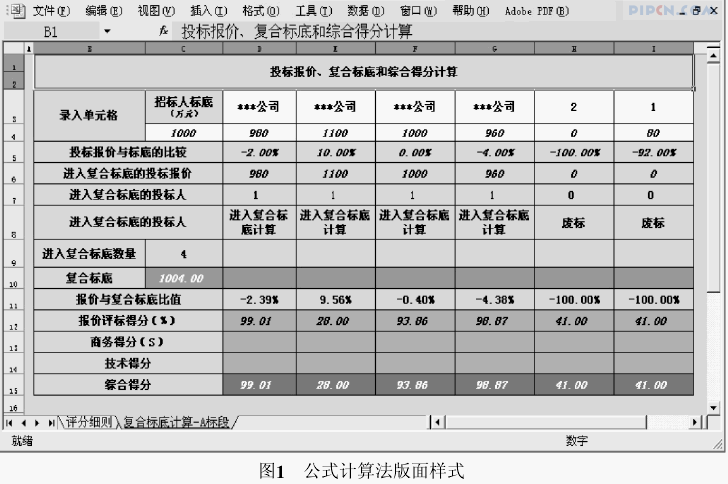 而常用的 Excel 操作简便,其强大的功能非常适于复合标底的计算。首先需要设定好版面样式,按照招标文件要求设定函数及计算公式,在开标时输入招标方标底和各投标方报价即可快速计算出得分。其优势不仅体现在开标得分结果的即输即现,在开标前的报价决策阶段,使用Excel 进行辅助投标报价推演也是异常直观、快捷,极大地提高了投标报价分析预测的效率及准确性。