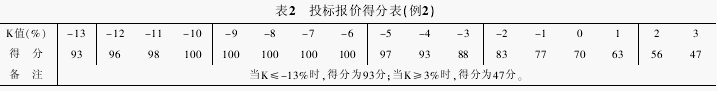 其中,A 为复合标底;Bn 为投标报价。当 K=-6%~-10%时投标报价得分为满分 100 分,其他得分根据表 2 按插入法计算。