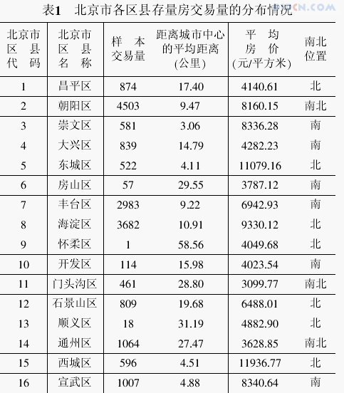 不同于单中心城市理论强调房产位置的重要性,目应用较多的特征价格模型(Hedonic Model)通常将房本身的特征作为主要研究对象,并不强调房屋坐落位的影响[2]。特征价格模型要求研究者搜集每个样本房自身特征相关的大量细节信息[3],研究者受此局限很扩大样本数量;相对而言,单中心城市模型并不要求样本的诸多细节[1],因此数据相对易得。如果位置能很好地解释房价,意味着可用的数据资源将大大增加,将使房产数据匮乏城市的房产市场研究变得可行。在本文的研究中,将北京市作为研究对象,定量分析房屋位置对北京存量房价格的解释力。