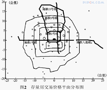 表 1 列出了北京市各区县存量房交易量的分布情况,其中朝阳区、海淀区和丰台区交易较活跃。图 1 和图 2分别是存量房交易价格三维分布图和平面分布图,更直观地表现了数据集的特征。图 1 和图 2 中坐标点(0,0)处均为天安门,以此来代表城市中心。图 2 中的四个闭合线圈由内到外分别是北京市二环、三环、四环及五环路,五条粗线是北京市已开通的地铁 1 号线、八通线、2 号线、5 号线和十三号线。因为房产位置信息没有精确到街道,所以在绘图过程中将 18111 条纪录所在的 82 个地区进行了平均化处理。图 2 中以圆圈来代表数据库中二级片区所处的位置,圆圈的直径表征该片区所有存量房的平均交易单价,直径越大则单价越高。从图 1、图 2 均可看出,北京市市中心地区房价最高,随着房屋坐落位置偏离市中心,房价呈快速递减的趋势,这样的趋势完全吻合经典单中心城市的理论假设,同时图中也体现出北京市高房价区有向北部偏移的趋势。
