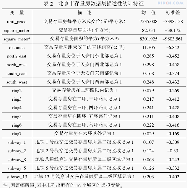 表 2 列出模型中所用变量的基本统计特征。所采用的数据中,存量房平均成交价为 7535 元/平方米,平均面积为 82.73 平方米,距离市中心的平均直线距离为11.7公里,其中有 28.5%的交易发生在北京东北部,29.9%在西北部,南部的交易量相对稀少,东南和西南加起来共41.6%。如果以环路来区分,二环以内、六环以外成交量极少,绝大部分存量房交易都发生在二环到六环之间,在每环较均匀分布,其中以三环到四环之间成交量最大,占总成交量的 24.12%。