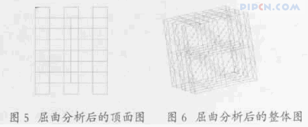 由 ANSYS 建模计算后,进行结构的线性屈曲分析,得到经线性屈曲分析后得到的临界屈曲荷载为 113.1t。模型屈曲变形如图 3~图 6 所示。