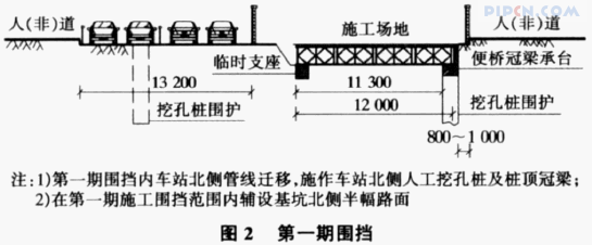 第二期围挡:占用汉中路南侧半幅路面进行施工围挡,利用基坑北侧临时路面系统以及南、北两侧人(非)道共同组成汉中路的临时道路。组织主体基坑南侧贝雷梁安装并施工主体结构。对跨上海路段部分的围护结构及贝雷梁架设施工采取局部倒边施工的办法予以解决。