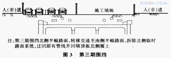 第三期围挡:在车站主体结构施工完成后,进行车站南侧顶板回填并恢复汉中路南侧半幅路面,作为施工阶段的临时道路,占用汉中路北半幅路面进行施工围挡,组织车站北侧临时路面系统的拆除并恢复汉中路北半幅道路。对跨上海路段部分的贝雷梁拆除施工采取局部倒边施工的办法予以解决(见图3)。
