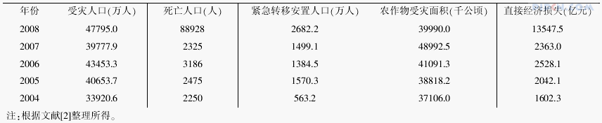 如表 1 所示,2004~2008 年洪涝、旱灾、火灾和地震等灾害对我国造成的损失居高不下,2008 年损失更是远超常年,城市灾害凸显。提高城市防灾功能水平具有现实迫切性。能持续满足功能要求的基础设施是城市系统正常运行的基础[1],作为城市基础设施的重要组成部分,城市防灾基础设施具有抵御突发灾害的功能,有效满足该功能要求是最经济、最安全又十分有效的防灾减灾措施,是提高城市和区域防灾水平的基础。因此,研究和评价城市防灾基础设施的功能安全,对城市防灾减灾具有重要作用。