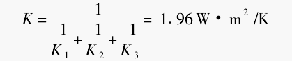 经济技术比较后[5],鉴于办公楼的外墙都为370mm厚,可采取在保留旧普通铝合金窗的基础上,在其外侧增装一个塑钢窗。那么,原来铝合金窗的传热系数K1=6·2W/(m2·K),新的塑钢窗的传热系数K2=4·7W/(m2·K),两个窗户之间至少有10mm以上的静止空气层K3≤7·3W/(m2·K),这样,组合窗的传热系数K近似计算为: