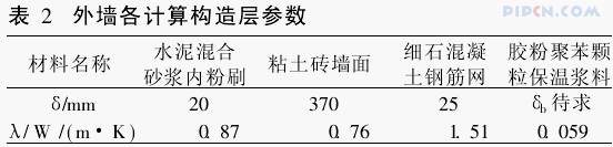 外墙的热工计算按不利于保温的单面加固外墙计算,因防护层、涂料层很薄,计算中不考虑它们对保温的有利作用。外墙各计算构造层的厚度和导热系数取值见表2。