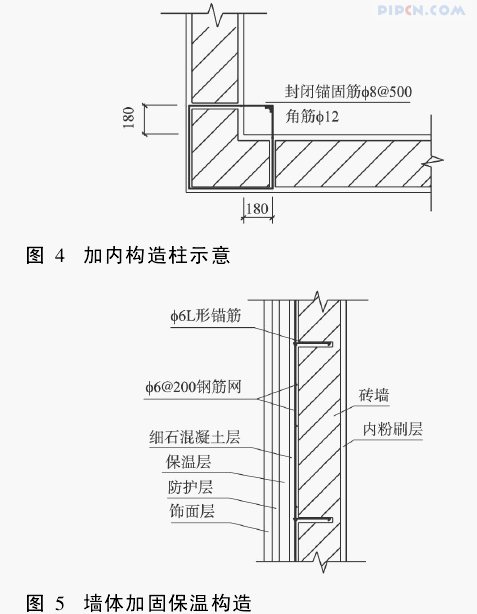 增设圈梁构造柱,为保留原建筑风貌,间距较大纵横墙及较薄弱窗间墙处增设钢拉杆内圈梁,大拐角处增设内构造柱。构造柱与砖墙用封闭箍筋连接,钢筋通过墙上钻出的孔洞穿过墙体,在室外紧贴剔除抹灰层的墙皮,伸入构造柱与其钢筋锚牢。加内构造柱作法及墙体加固构造(带保温层)如图4,5所示。