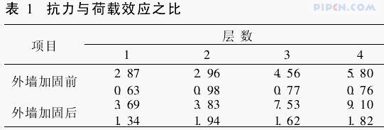 根据实测墙厚及材料强度检测结果,使用PKPM软件进行承重墙体的非抗震承载力验算。表1列出各层外墙加固前后的抗力与荷载效应之比的最大值和最小值。