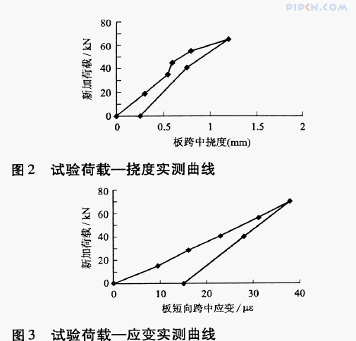在整个试验过程中,直到最大加载,楼板挠度及裂缝宽度(约为0·06mm),均远小于规范的限值,结构处于弹性变形状态,未出现任何破坏标志或迹象,证明楼盖满足承载能力极限状态的性能要求。