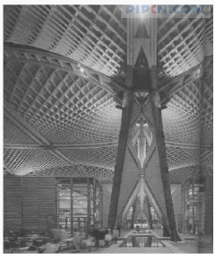 日本建筑师阪茂(BanShigem)的日本馆(图2)不仅体现了“人·自然·技术”的世博会主题,也再现了日本的文化传统和创新精神。基于日本传统的人天合一观念和对纸、木及其他材料的偏爱,该展馆吸取了日本传统住屋中的障子(shoji),即木格纸门窗的意匠。采用经回收加工的纸料建成,拱筒形的结构由直径12.5cm粗的纸筒网状交叉构成,弧曲屋面和墙身材料也是织物和纸膜。该临时性建筑在历时5个月的世博会后,其大部分材料都可以回收投入再使用,因此这是个建造、拆毁和再生的象征。