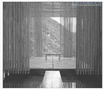 图8 张永和的概念探索———竹化城市在建筑师隈研吾的长城脚下公社“竹屋”(图9)的项目中,他认为竹子在中国与日本文化中具有独特涵养,并把竹子的雕塑立在水关粗犷的岩石中。他根据地形地貌把节距、粗细各不相同竹子作为分隔建筑内外的主要材料。视竹子的密度与直径,提供了各种不同的空间分隔,放置了像长城一样沿着基地斜面的一层竹子。