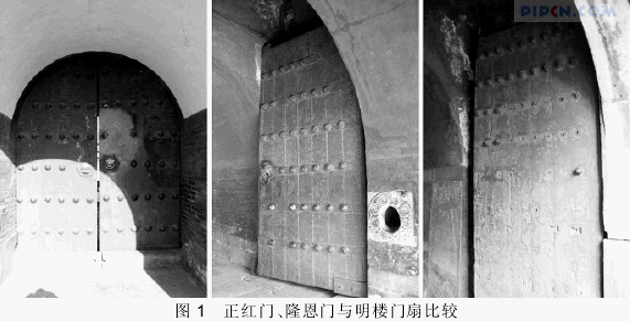 在中原的礼制文化中,等级制度是其中最为重要的一个组成部分,而且它还渗透到了社会的方方面面之中。表现在建筑中,无论是房屋的开间数还是对屋顶形式、建筑色彩、建筑构件的使用上,均有严格的贵贱等级之分,不能随意逾越,在关内明清各陵都毫无例外地恪守了这一思想。但在清昭陵中,这一思想却有所缺失。在房屋开间数上,有奇数也有偶数,果房是两开间,而隆恩殿与东西配殿等却均是五开间。再看对屋顶的使用上,建筑的主次关系没有与屋顶形式的尊卑进行严格地匹配,隆恩殿虽是整个陵寝的最核心建筑,但仅是单檐歇山顶,较明楼和神功圣德碑亭的重檐歇山顶等级还要低;再如正红门、隆恩门与明楼门扇上的门钉(图 1),数目各异;至于正红门外东西两侧院落的硬山式入口建筑,使用了斗拱,上覆黄色琉璃瓦,而涤器房等东西朝房的歇山屋顶却未设斗拱,覆青瓦。这些现象都说明早期满族人虽然吸收了汉文化,但对于其建筑等级制度文化的周密考虑和形式上的体现却未了解到其精髓所在。
