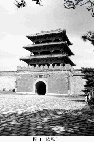 清昭陵的建筑单体还有一个与关内明清诸皇陵较为不同的地方,就是使用了大量的楼阁式建筑,如隆恩门(图 3)、四座角楼、两座配楼———晾果楼等,约占其建筑总数的 25%。出现这种现象,一方面是出于营建一个“城堡式”陵寝的需要,作为进入方城通道的隆恩门和用于守望的角楼,他们的防御性均举足轻重,建高既可以望远,又可以使观赏功能得到满足;而另一方面则反映出了满族人在长期生活实践中形成的喜好楼阁的审美定式。早期满族人长期生活在东北长白山区,为了防御野兽的侵扰,逐渐形成了喜爱居高的习惯,虽后来辗转迁至辽宁东南部丘陵地区的苏子河流域,但部落之间以及部落与明朝之间的战事不断,使得满族人形成了极强的“自卫防御心理”,通过建造楼阁来进行了望和防御,同时又是对原有生活模式的一种保留,从一定意义上讲,楼阁可以称作是满族人对原生活环境的变相模拟。至于用楼阁作仓储建筑,是为了争取更多的使用空间。满族人早期生活以游牧渔猎为主,半定居的生活方式使其对于储藏食品极为重视,因而仓储面积在其生活空间中占有极大的份额,为了节省用地,也为了更好的储存食品,将库房建作楼阁样式,如在沈阳故宫大清门外和清宁宫北面就设置了果楼、放炭楼、肉楼等等。