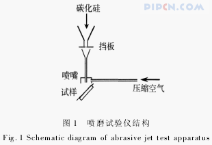 喷磨试验法测定平均耐磨性的原理是:由干燥空气流或惰性气体气流将碳化硅颗粒喷射在试样一个小的检验区上,直到裸露出金属基体为止,试样的平均耐磨性用喷磨时间或喷磨所用碳化硅的质量来表示。测试结果需和标准试样的测试结果相比较,以相对耐磨性的形式给出。本试验中所用仪器为自主研发的喷磨试验仪,图1为所用仪器的示意图,其中,试样面与喷嘴的轴线呈55°。