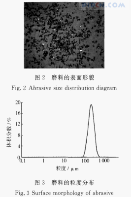 试验中使用的磨料为绿碳化硅,形状为多角形(见图2),其粒度为F100,粒度分布见图3。磨料使用前需于105℃下烘干(需烘烤约2h)。