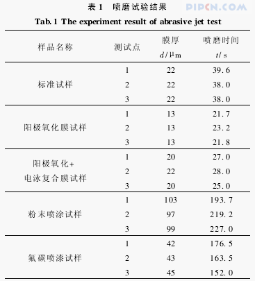 选用经不同表面处理方法处理的建筑铝型材进行喷磨试验。喷磨试验是一种相对耐磨性试验,测量的是整个膜厚意义上的平均耐磨性能,其试验结果需与标准试样进行对比,本试验中选择膜厚为22μm的阳极氧化膜试样作为标准试样。各样品的测试结果见表1,可以看出,喷磨试验结果具有很好的重现性。
