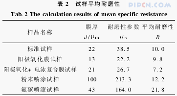 标准试样的平均耐磨性为10,根据表1中标准试样的喷磨试验数据可以得出所用喷磨试验仪的喷磨系数K为0.57μm/s,根据公式(1)可得出各建筑铝型材试样的平均耐磨性,见表2。试样的平均耐磨性数值如果大于10,说明其耐磨性好于标准试样;反之,则试样的耐磨性比标准试样差。