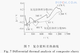 一水软铝石、三水软铝石形成的峰、γ-Al2O3和α-Al2O3的转变峰;不同的是,图7中还出现了氧化锆的转变峰。从图7中可以看出:1)氧化铝体积分数为15%的复合浆料水分挥发和一水与三水软铝石的形成峰值为100℃,γ-Al2O3的形成峰为340℃,α-Al2O3的转变峰为1178℃;2)氧化铝体积分数为50%的复合浆料水分挥发和一水与三水软铝石的形成峰值为130℃,γ-Al2O3的形成峰为401℃,α-Al2O3的转变峰为1268℃。