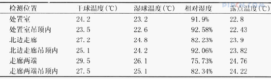 从现场检测数据反映出:1)2楼走道内空气的相对湿度和吊顶内的相对湿都很高,在82%—92%之间。2)走廊两端空气的湿度较低,相对湿度75.73%,吊顶也几乎没有发霉。