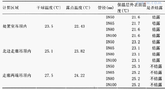 从计算结果来看,采用设计要求的保温层厚度,在医院现场高湿度的环境中,水管保温层外表面温度低于露点温度,将会产生结露,计算结果与实际情况一致。走廊两端吊顶内的冷冻水管保温层外表面温度要高于周围空气的露点温度,不会结露,与实际情况一致。