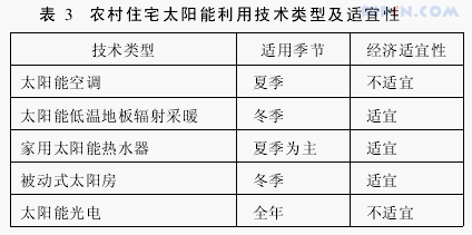 根据农村住宅建筑的形式特点,可以用于点式低层建筑的太阳能利用类型及技术。经济适宜性分析见表3。