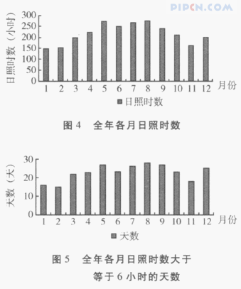 由图5可知,各月的太阳日照时数大于等于6小时的天数为273天,因此杭州地区的太阳能利用价值中等,其中5-9月的利用价值相对较高。