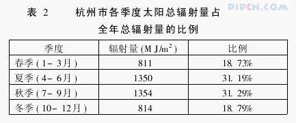 表2为杭州全年各季节太阳辐射量的比例,可以看出,4-9月份,太阳能辐射占全年70%以上,日照辐射量相对较高。