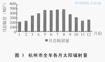 图3为典型气象年全年各月太阳辐射量,从而计算出年太阳总辐射量约为4329MJ/m2,即年太阳总辐射量为1202kWh/(m2·a)。按表1进行评判,杭州市的太阳能资源丰富程度等级属于资源较贫乏。