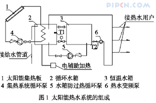 (5) 辅助电加热控制:冬季或连续阴天时,T2见图1达不到55℃,则启动辅助电加热,保证热水供应。