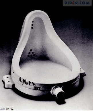 1917年,杜尚将一个从商店买来的男用小便池起名为《泉》,匿名送到美国独立艺术家展览要求作为艺术品展出,《泉》一经展出立即引起各方哗然和不休止的争论,成为现代艺术史上里程碑式的事件。作品以现成品来实现,以此来否定传统绘画等艺术品的仪式感与崇高性,这是他对现代艺术的蔑视与批判。