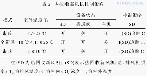 整个空调系统中安装了楼宇自动控制系统,其控制策略见表 2。控制过程主要是通过检测室外温度来实现空调主机、热回收新风机和旁通阀间的连动。