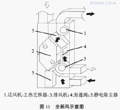 室外的新风由送风机引入热回收新风机内,新风机内的旁通阀打开,新风经由旁通阀直接送入室内;排风则在排风机的作用下经热交换器直接排出(如图11 所示)。新风、排风经由不同的路径不会产生混合,实现全新风。由于新风在热回收新风机内没有经过热交换器,风机的阻力降低,送风机的送风量可达到额定值的 1.2 倍。
