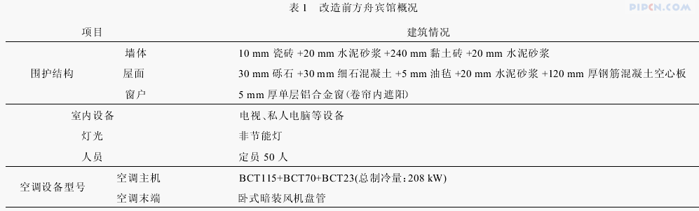 方舟宾馆(如图 1)建于 1994 年,位于长沙市东郊远大城内,主要用于接待重要的客户。建筑共分 4 层:地下 1 层为公司总机和辅助用房;1~3 层为宾馆客房。建筑面积 1 684 m2,空调面积 1 420 m2。改造前,建筑的围护结构主要为 240 mm 厚的砖墙和铝合金单层玻璃窗,空调主机采用小型非电空调,室内为传统的风机盘管系统,无新风,主要通过开窗取新风。其建筑具体情况见表 1。2006~2008 年对方舟宾馆的能耗进行了统计,从统计的数据来看,方舟宾馆的建筑制冷、采暖燃料消耗为 354 kW·h/m2(折合成一次能源,下同),输配系统电耗 45 kW·h,空调系统总能耗达 399 kW·h,为典型的高能耗建筑。