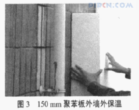 方舟宾馆外墙和屋顶总面积约 1 700 m2,改造前没有采取任何节能措施,是建筑主要的散热部位。改造中采用薄抹灰外墙外保温系统,在原外墙基础上粘贴 150 mm 的膨胀聚苯板(如图 3),传热系数下降到0.24 W/ (m·2K)。屋面采用 100 mm 膨胀聚苯板外保温,传热系数 0.34 W/(m2·K)。