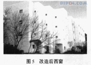 在窗户的改造中,首先,将窗户的面积改小(如图 5),原建筑窗户总面积 298 m2,改造后窗户面积只有 75 m2,窗墙比由 25%下降到 6.3%。其次,将原铝合金单层玻璃窗全部换成 3 层玻璃塑框窗,玻璃间隔层间充氩气,在窗框和玻璃间加装密封条,窗户的传热系数为 1.65 W/(m·2K)。