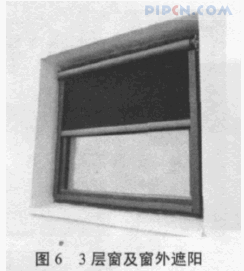 为达到最大的节能效果,在东面和西面的 3 层玻璃窗外安装外遮阳(如图 6)。外遮阳采用电动布卷帘形式,可根据室外天气情况和室内人员观景需求调节遮阳的面积,控制进入室内的太阳辐射。对于南面外窗,由于大部分时间太阳都是斜射,因此,只需要安装固定遮阳板就可满足夏天的遮阳和冬天采暖。