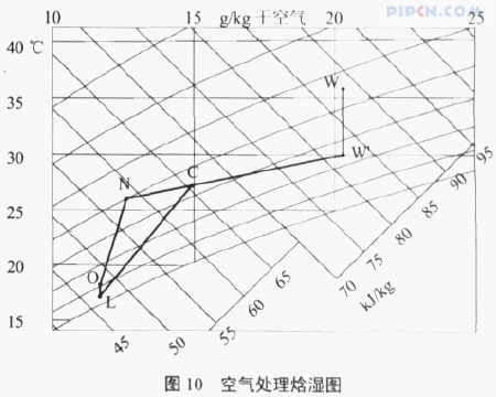 热回收新风机内安装高效热交换器,其热交换效率夏季为 70%,冬季为 90%。制冷季空气处理过程如图 10 所示。室外新风经热交换器与排风中热量进行热交换后,由状态点 W 处理到状态点 W',再与室内的部分回风混合达到状态点 C。混合后的空气最后由空调盘管降温到 18 ℃送入室内,此状态点较接近露点 (17.6 ℃)。整幢建筑采用 2 台新风量为 1 500 m3/h的热回收新风机,新风换气次数达到 1.5 次 /h。