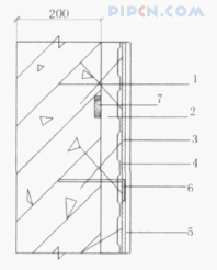 1一现浇混凝土外墙;2—EPS钢丝网架聚苯板;3一掺外加剂的水泥砂浆抹面层;4—Φ2钢丝网架;5—面砖饰面层;6—Φ6钢筋:7—水泥砂浆垫块.