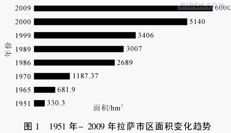 自公元633年松赞干布建都拉萨以来,由于长期分裂割据及恶劣的自然条件的限制,城镇发展受限。拉萨市规模在历史时期变化不明显,市区范围在“以大昭寺—布达拉宫(AD650~842)”—“以大昭寺为中心(AD842~1644)”—“以大昭寺—布达拉宫(AD1644~1951)”间变更;空间布局上呈“东西两个核心区”或东(大昭寺周围)或西(布达拉宫周围)的“单一核心区”间变更;城区规模无显著变化,面积变化在1~km2之间[3]。1951年西藏和平解放以来,随着国家对拉萨投资力度的加大,拉萨城区发生了很大的变化(见图1)。目前拉萨市辖城区总面积60km2[4]。市区户籍人口由1981年的37.3万人增加到2007年的45.3万人,现有外来常住人口13.7万人。