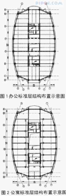 图 1 为办公标准层(层高 4m)结构布置示意图,图 2 为公寓标准层(层高 3.7m)结构布置示意图。