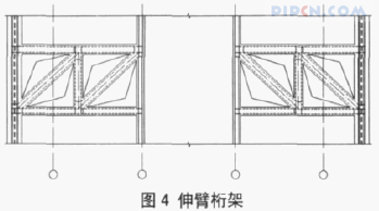 工程屋面标高 181.9m,考虑构架后(见图 3)顶标高达 222m,计算表明为风荷载起控制作用,结构位移控制指标按 222m 取用即为 1/584。本工程主楼标准层建筑宽 27.5m、内筒宽 9.5m、长 31.5m,外柱至内筒最远距离 12.8m、最近 8.8m。采用型钢混凝土框架 - 钢筋混凝土筒体结构,即:主塔采用混凝土筒体(考虑构造及延性在角部等内置 H 型钢骨,不参与计算),十字形钢管混凝土芯柱,型钢混凝土梁(办公部分次梁采用混凝土梁)。工程高宽比 H/B=6.6<7,内筒宽为总高的 1/19。内筒高宽比远远小于规范建议1/12,是本工程的最大特点。为此综合分析了不设加强层、设加强层(伸臂桁架方案)、设加强层(刚性墙方案)等几种方案,分析计算表明需设置加强层以提高整体刚度。计算过程中调整了墙肢及梁柱截面,为便于设备管线通过(工程两个 6m 层高的加强层同时也是设备层、避难层,设置了大体积混凝土水箱、电力机房),确定了伸臂桁架的结构加强方案,即在 15层~16 层间(层高 6m)、25 层~26 层间(层高 6m)、42m~181.9m (主要屋面标高) 主结构屋面(层高3.7m)层间鬂轴、鬄轴、鬅轴、鬆轴各设置 4 榀伸臂桁架,如图 4 所示。