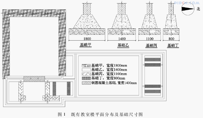 整栋楼建筑平面呈“L” 形,东西向总长39. 65m,南北向总宽 23. 13m,为二层坡屋顶砖混结构,檐口高度 10. 55m (绝对高程 53. 85m)。室内地坪最低处标高 43. 47m,室内地坪最高处标高44. 57m,室外地坪标高 43. 30m。红色砖砌外墙,素混凝土条形基础,埋深约 1. 0m (下部 300mm 厚毛石混凝土,上部 700mm 厚 90 号素混凝土),基础宽度 分 别 为 1. 8m、1. 4m、1. 1m 及 0. 8m 四 种(见图 1)。