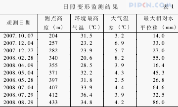 新电视塔施工期间,采用全站仪进行了全程日照变形监测,监测期为 2007 年 10 月至 2008 年 8月,每月进行 1 次日照变形观测,具体观测结果见表 1 (表 1 中大气温差为测量期间最高气温与最低气温之差,最低气温都是测量开始时刻的气温。相对水平位移为一天中观测点的位置相对于测量开始时刻的位置)。由表 1 可知,随着施工高度增加,其最大的相对水平位移也逐渐增大,且大气温差变化大的时候,其相对水平位移也增大。