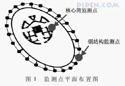 广州新电视塔为广州又一标志性建筑,主塔高454m,顶部天线桅杆 156m,总高度 610m,为目前世界之最。新电视塔的建筑结构是由一个向上旋转的椭圆形钢外壳变化生成,相对于塔的顶、底部,其腰部纤细。结构采用筒中筒结构,通过其外部的钢斜柱、斜撑、环梁和内部的钢筋混凝土筒充分展现了建筑所要表达的建筑造型。钢结构外筒是结构主要的垂直承重及抗侧力构件,包括三种类型的构件: 立柱,环梁和斜撑。外筒共有 24 根柱,由地下二层柱定位点沿直线至塔体顶部相应的柱定位点,全部采用钢管混凝土组合柱。新电视塔具有结构超高、形体奇特和结构复杂的特点,进行建造过程的施工监控与运营期间的健康监测具有十分重要的意义,而日照变形监测正是监测内容的重要组成部分之一。为保证新电视塔在施工阶段及竣工后结构的各种工作状态满足设计要求,评价其安全性能,并对其在施工期间和运营阶段结构是否受到损伤,以及损伤的程度进行监测,需要建立一套完整的结构健康监测系统,进行实时在线监测。由于塔的施工主要是靠装配在核心筒顶部的两台塔吊来进行的,过大的顶部侧向变形会造成不利的施工荷载,也严重影响外筒钢结构吊装的精度。因此,为确保塔体的水平位移在规范要求的范围内,同时指导施工,设计要求在电视塔施工过程中,进行全程日照变形监测。日照变形监测方案: ①在电视塔结构施工期间,采用徕卡 TCA1800 全站仪进行观测。