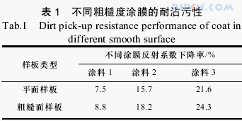 由实验结果可以看出,涂膜性状与其耐沾污性密切相关。粗糙度大的涂膜更容易污染,因此,市区建筑物外墙在施工时,应提高涂膜的平整性改善其耐沾污性。