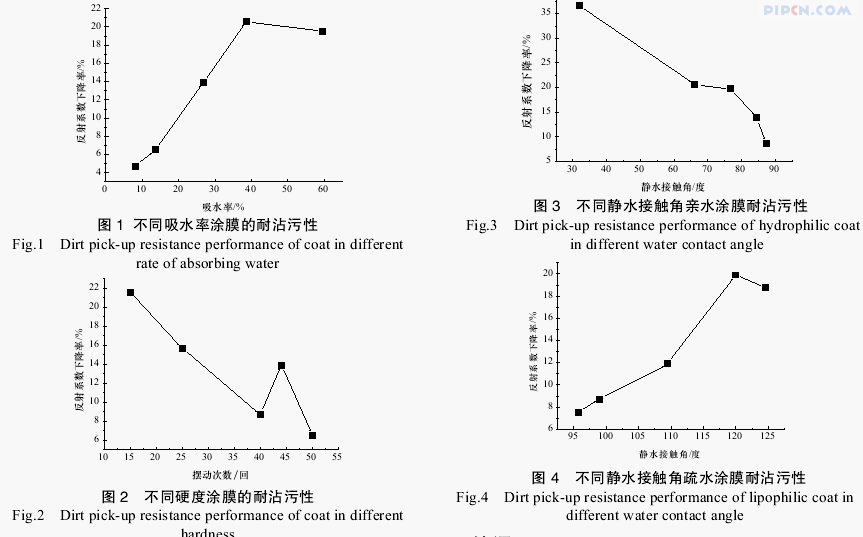 样板的制备按 GB9271-88 进行。吸水率测试按 HG2-1612-85 进行。涂膜耐沾污性测试方法按 GB/T9757-2001 进行。取制备养护好样板,先分别测定其吸水率、硬度、静水接触角,筛选出具有不同吸水率、硬度、静水接触角的样板,再对筛选出的样板进行耐沾污性测试。