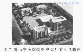 ⑶不断改善厂区的外部环境,利用树木、花草以及湖面景观增加了厂区的整体绿化层次,又为企业员工创造了归属感和亲切感的良好氛围,提供了工余休闲放松的场所,提高了员工的工作环境质量,最终达到提高工作效率的目的。图 7 是佛山中医院制剂中心厂前区鸟瞰图。